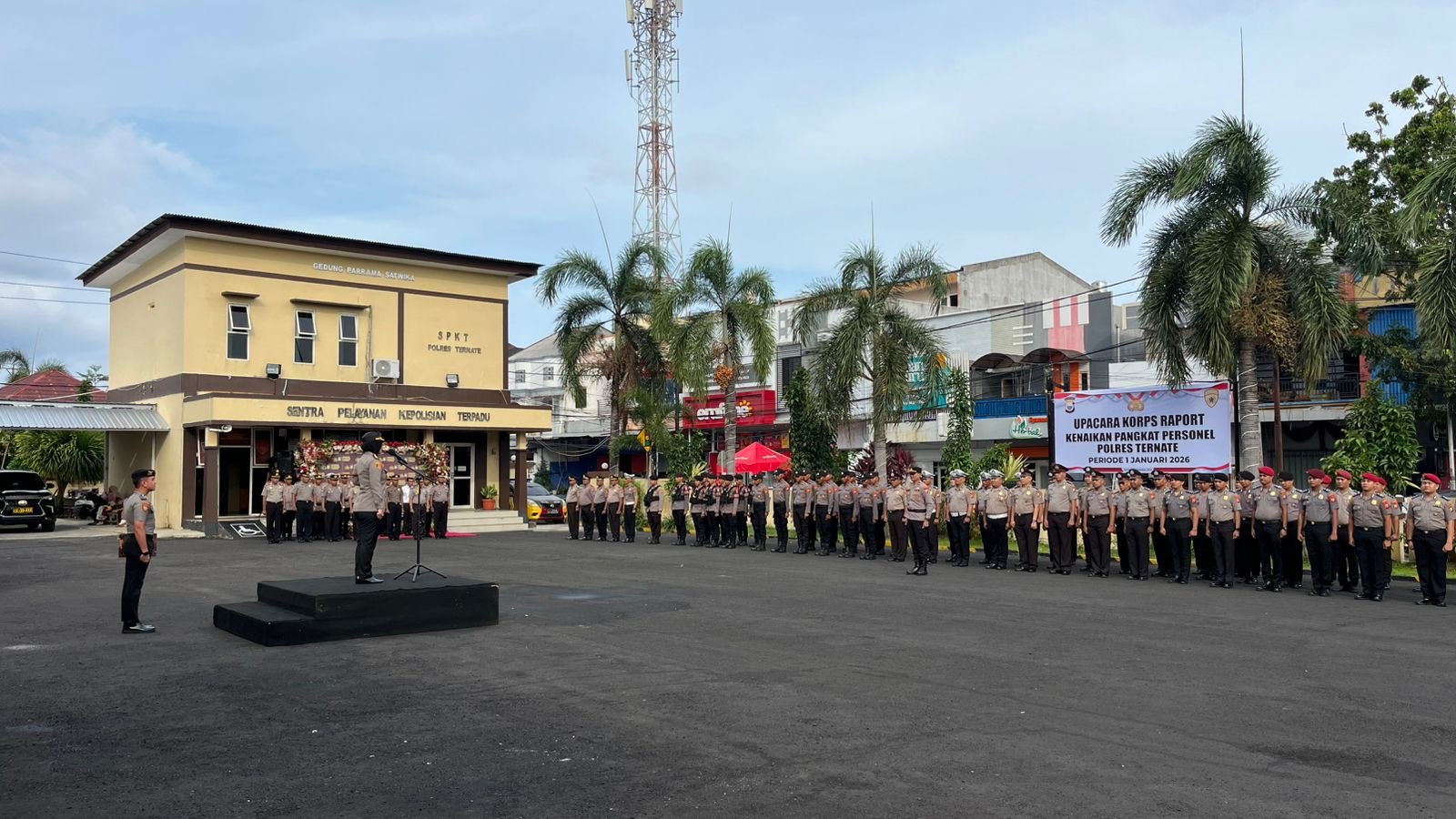 Ternate – Polres Ternate menggelar Upacara Korps Raport Kenaikan Pangkat bagi 52 personel periode 1 Januari 2026, yang bertempat di Lapangan Apel Mapolres Ternate, Kelurahan Takoma, Kecamatan Ternate Tengah, pada Rabu, (31/12/25).