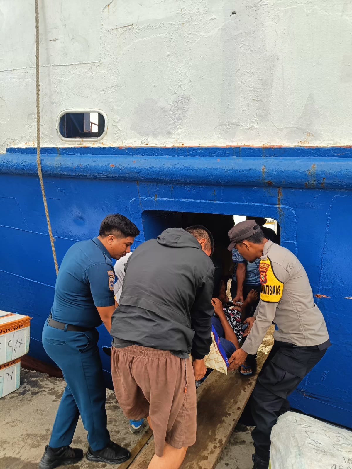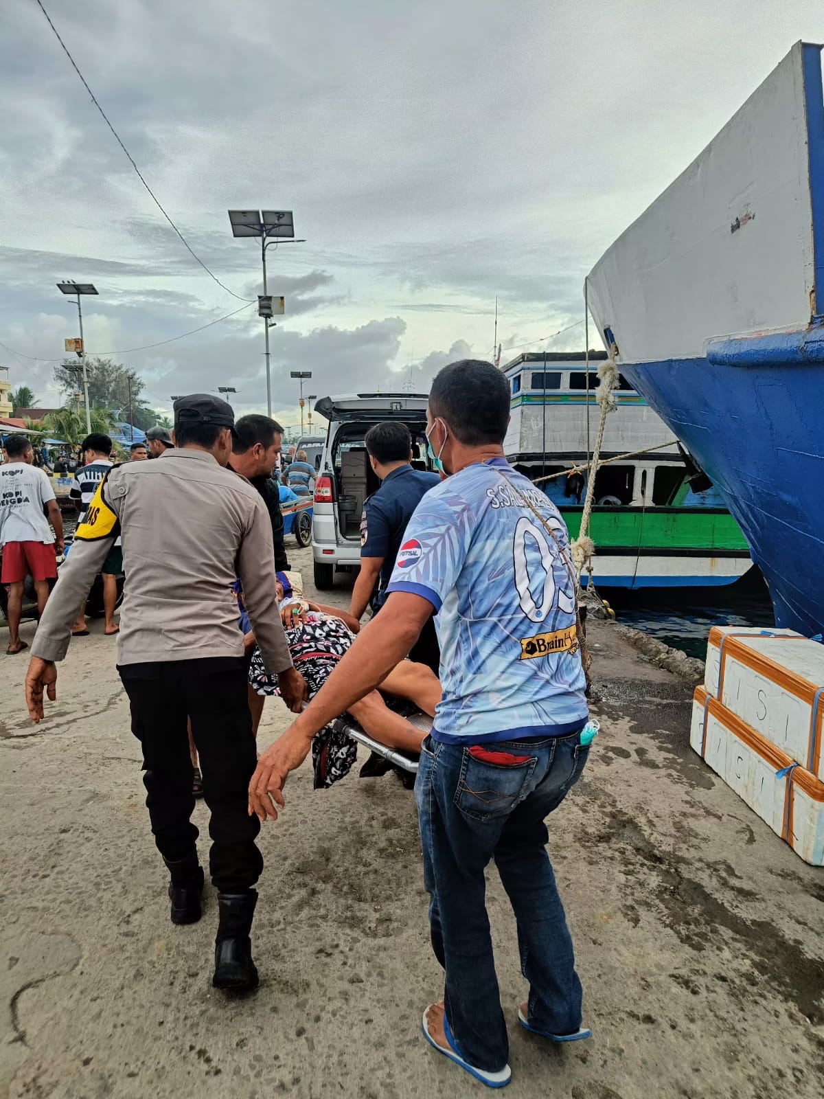 Dengan dibantu masyarakat sekitar, petugas mengevakuasi penumpang tersebut secara hati-hati menggunakan alat bantu manual dan memastikan keselamatan selama proses turun dari kapal menuju area yang lebih aman.