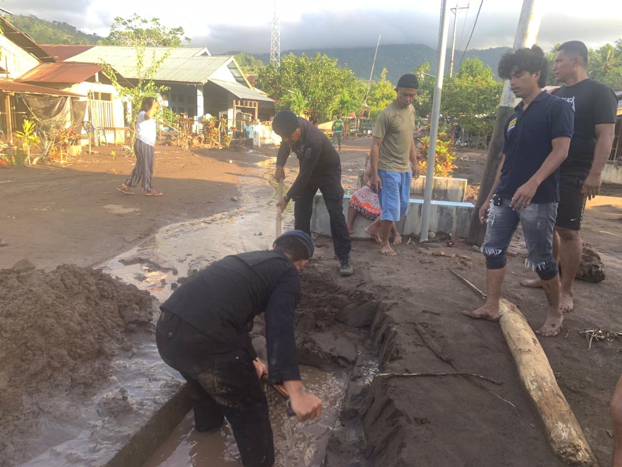 Satbrimob Polda Maluku Utara bersama tim gabungan dan warga setempat kembali melanjutkan penanganan bencana banjir di Kecamatan Loloda, Kabupaten Halmahera Utara, Minggu (18/1/2026).
