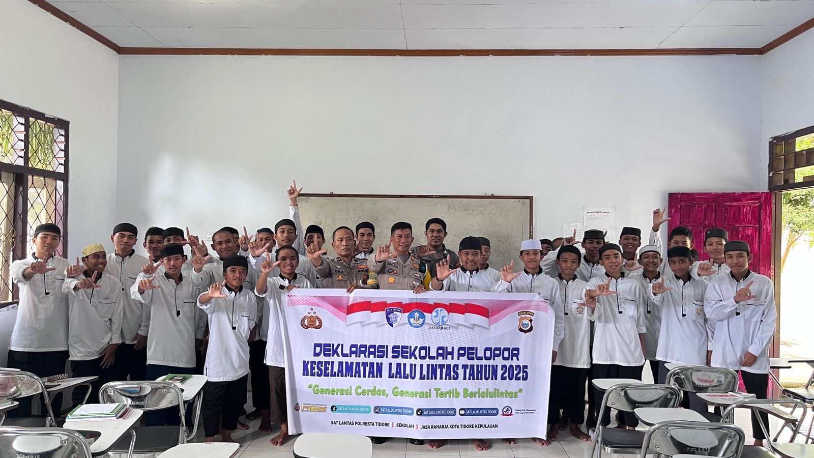 Satuan Lalu Lintas Polresta Tidore menggelar sosialisasi Deklarasi Sekolah Pelopor Keselamatan Lalu Lintas Tahun 2025 di Pondok Pesantren Ali Bin Abi Tholib, Selasa (25/11/2025). Kegiatan ini mengusung tema “Generasi Cerdas, Generasi Tertib Berlalu Lintas.”