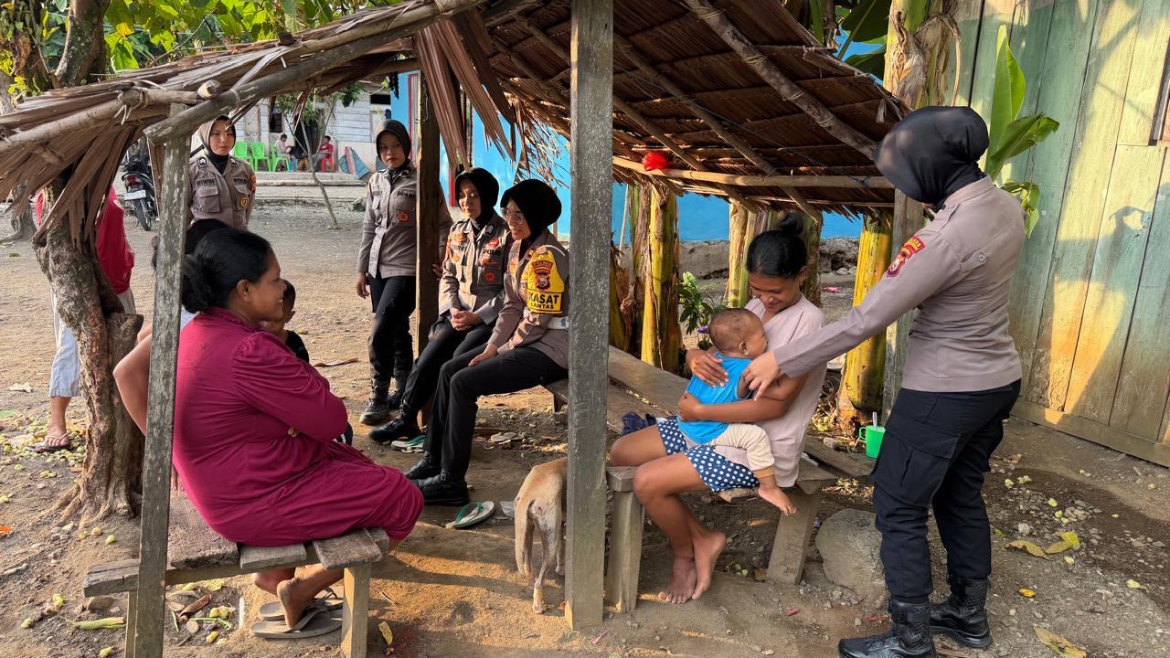 Personel Polisi Wanita (Polwan) Polres Halmahera Tengah melaksanakan kegiatan trauma healing secara door to door di Desa Sibenpopo, Sabtu (11/4/2026). Kegiatan ini dilakukan sebagai bentuk kepedulian terhadap warga, khususnya anak-anak dan orang tua yang terdampak situasi sulit pascakonflik.