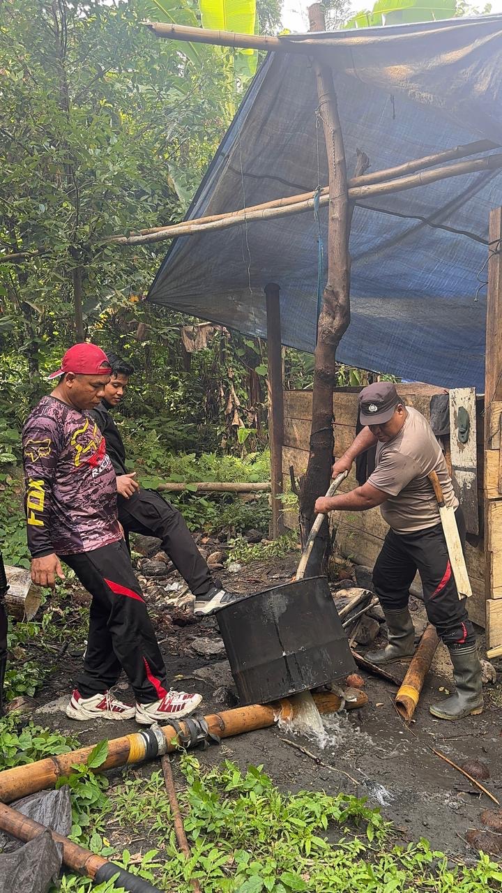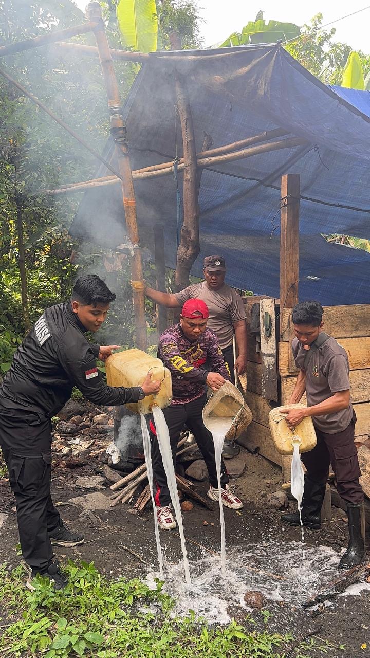 Dalam pelaksanaan kegiatan tersebut, petugas melakukan penyisiran di lokasi yang diduga sebagai tempat pembuatan minuman keras tradisional, cap tikus, di area perkebunan desa Sawadai, Kec. Bacan Selatan.