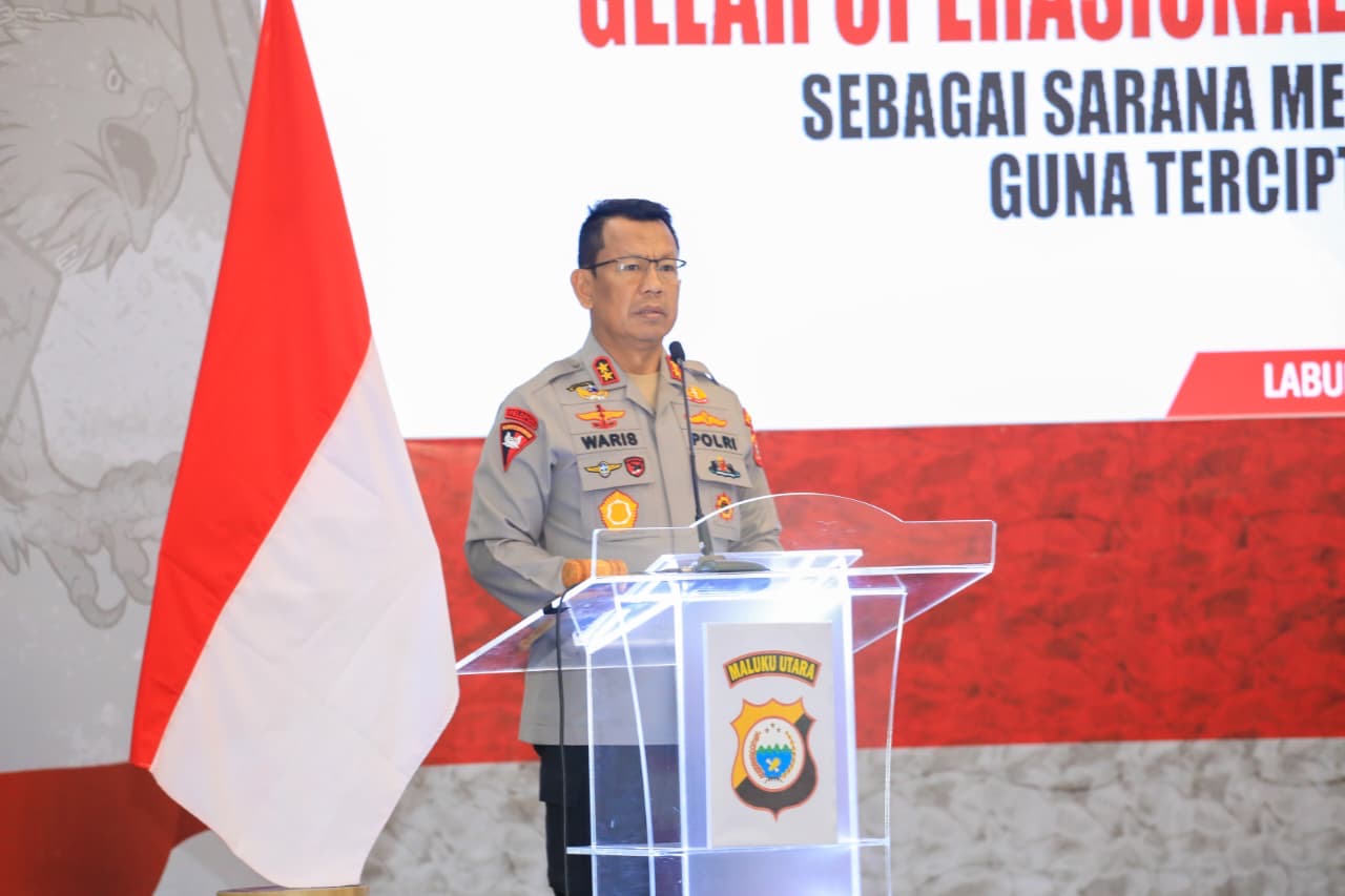 Kepala Kepolisian Daerah Maluku Utara, Irjen Pol. Drs. Waris Agono, M.Si., membuka kegiatan Gelar Operasional (GO) Bidang Pembinaan dan Operasional Triwulan III Tahun 2025, Selasa (7/10/2025), di Aula Kantor Pemda Kabupaten Halmahera Selatan.