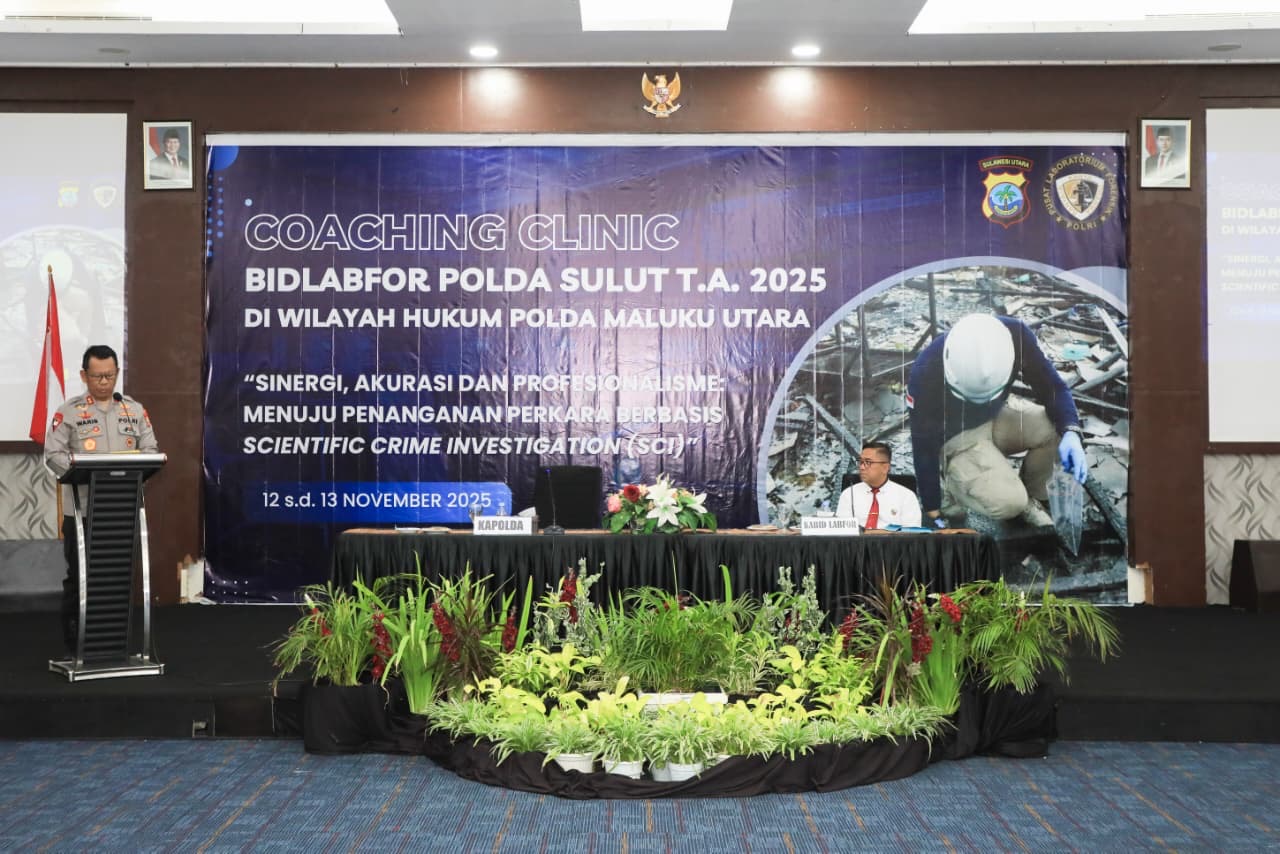 Kepala Kepolisian Daerah Maluku Utara, Irjen Pol. Drs. Waris Agono, M.Si, menghadiri sekaligus membuka secara resmi kegiatan Coaching Clinic Bidang Laboratorium Forensik (Bidlabfor) Polda Sulawesi Utara T.A. 2025, yang berlangsung di Ballroom Hotel Muara, Rabu (12/11).