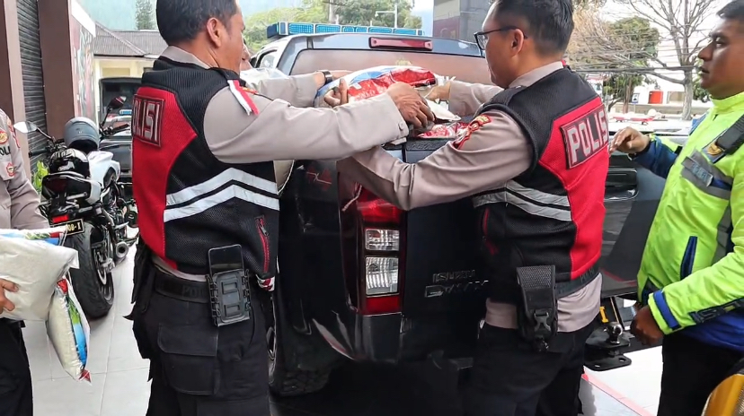 Kapolres Aceh Tengah menyerahkan puluhan paket bantuan berupa sembako, di antaranya beras, mi instan, roti dan snack, berbagai jenis susu, gula, kopi, bubur instan, deterjen, pakaian wanita, serta air mineral guna membantu memenuhi kebutuhan dasar para pengungsi.