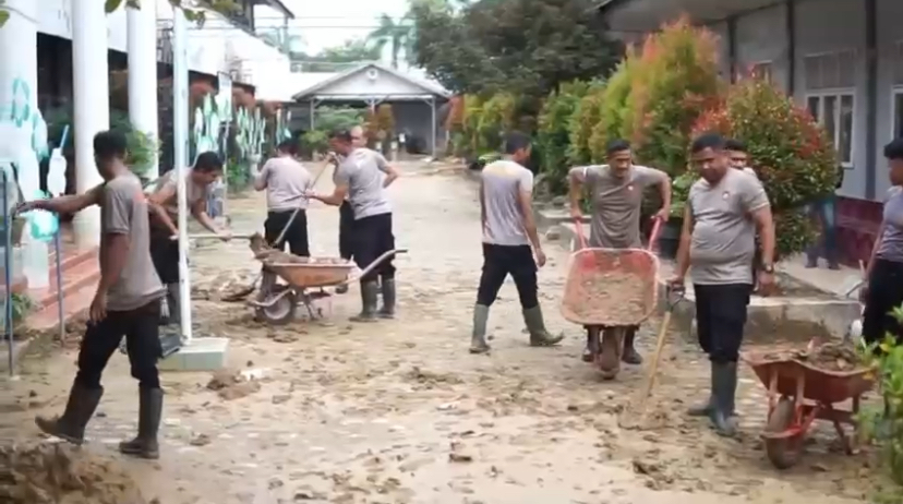 Sebagai bentuk kepedulian dan respons cepat terhadap kondisi tersebut, pada Senin (29/12/2025) personel Polres Langsa turun langsung ke lokasi memulai pembersihan. Dengan peralatan sederhana seperti cangkul, sekop, dan kereta dorong, personel Polri bersama para guru bergotong royong membersihkan lumpur di halaman dan ruang kelas agar sarana pendidikan dapat segera difungsikan kembali.