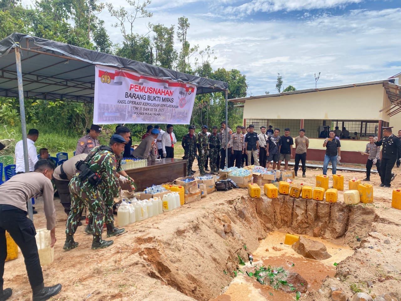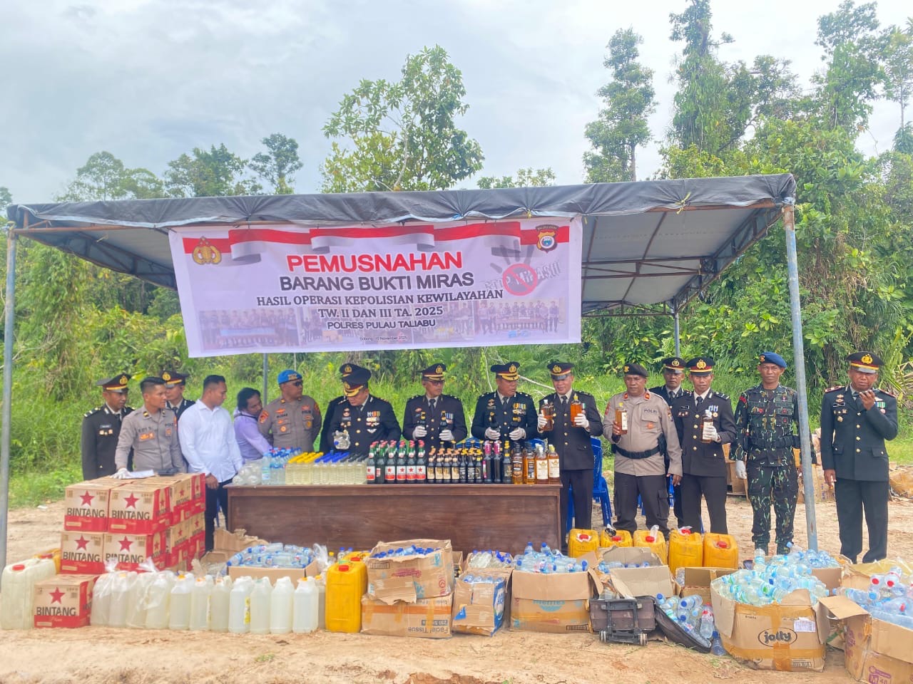 Polda Maluku Utara melalui Polres Pulau Taliabu memusnahkan ribuan liter minuman keras berbagai jenis hasil operasi kepolisian wilayah triwulan III dan IV tahun 2025. Kegiatan pemusnahan berlangsung di halaman Mapolres Pulau Taliabu, Senin (10/11/2025).