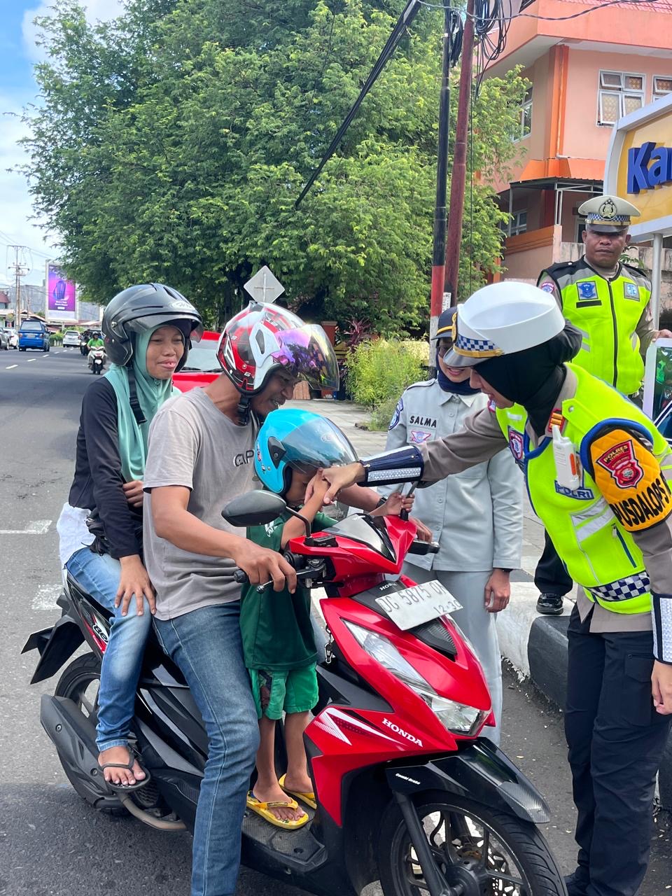 Sebagai bentuk kepedulian Polri terhadap keselamatan pengguna jalan, personel membagikan helm SNI, dan juga menyampaikan pesan-pesan keselamatan berlalu lintas, agar pengendara selalu berhati-hati dan mematuhi peraturan saat berkendara.