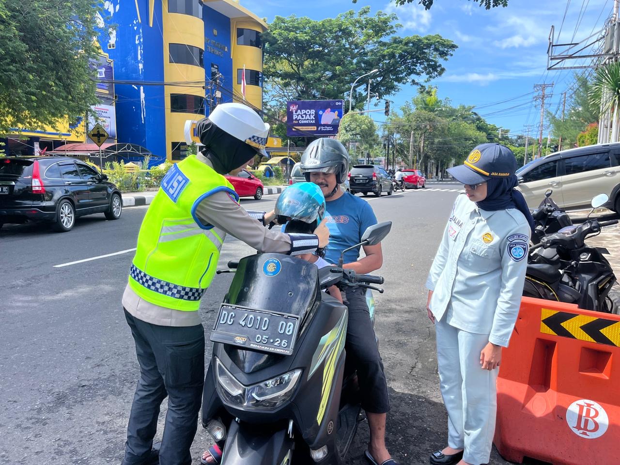 Ternate – Dalam rangka mendukung pelaksanaan Operasi Keselamatan Kie Raha 2026, Satuan Lalu Lintas (Satlantas) Polres Ternate bekerja sama dengan PT. Jasa Raharja yang dipimpin oleh Kasat Lantas, AKP Farha, S.Tr.K., S.I.K., melaksanakan pembagian helm gratis bagi pengendara roda dua di sejumlah titik di Kota Ternate, Kamis (05/2/26).