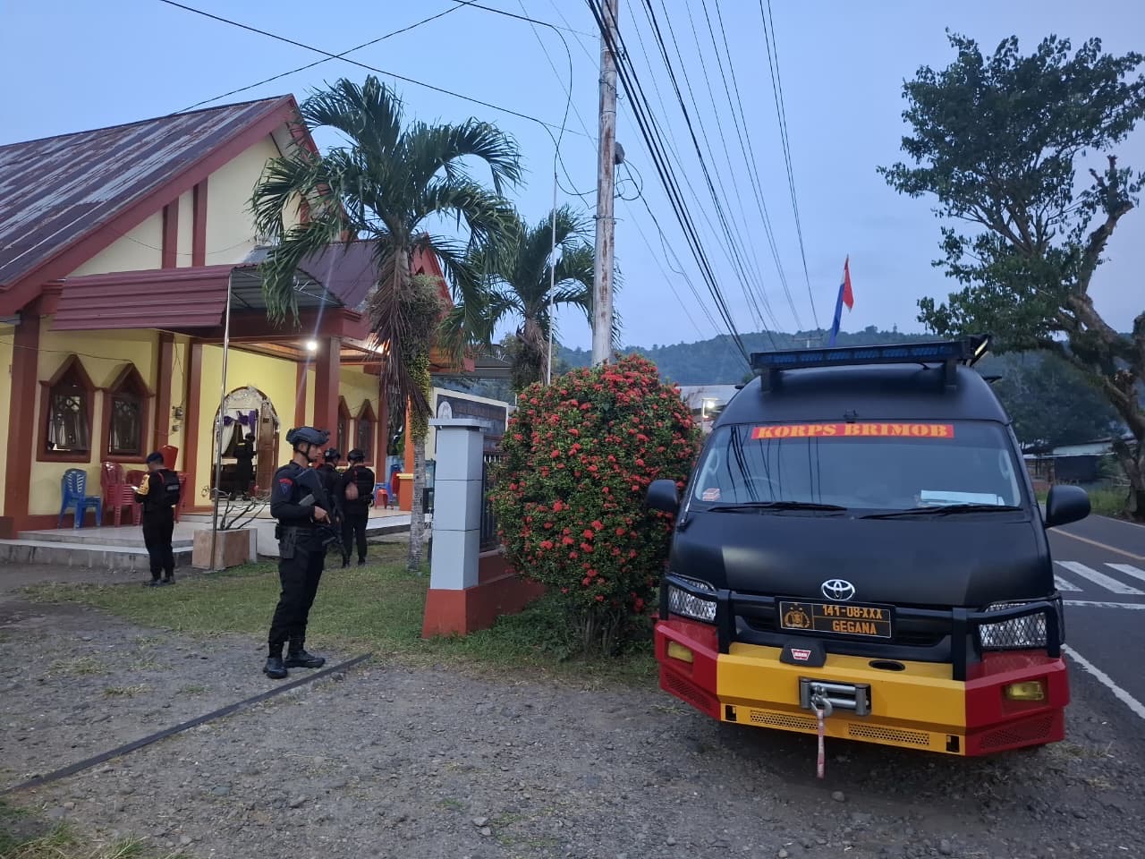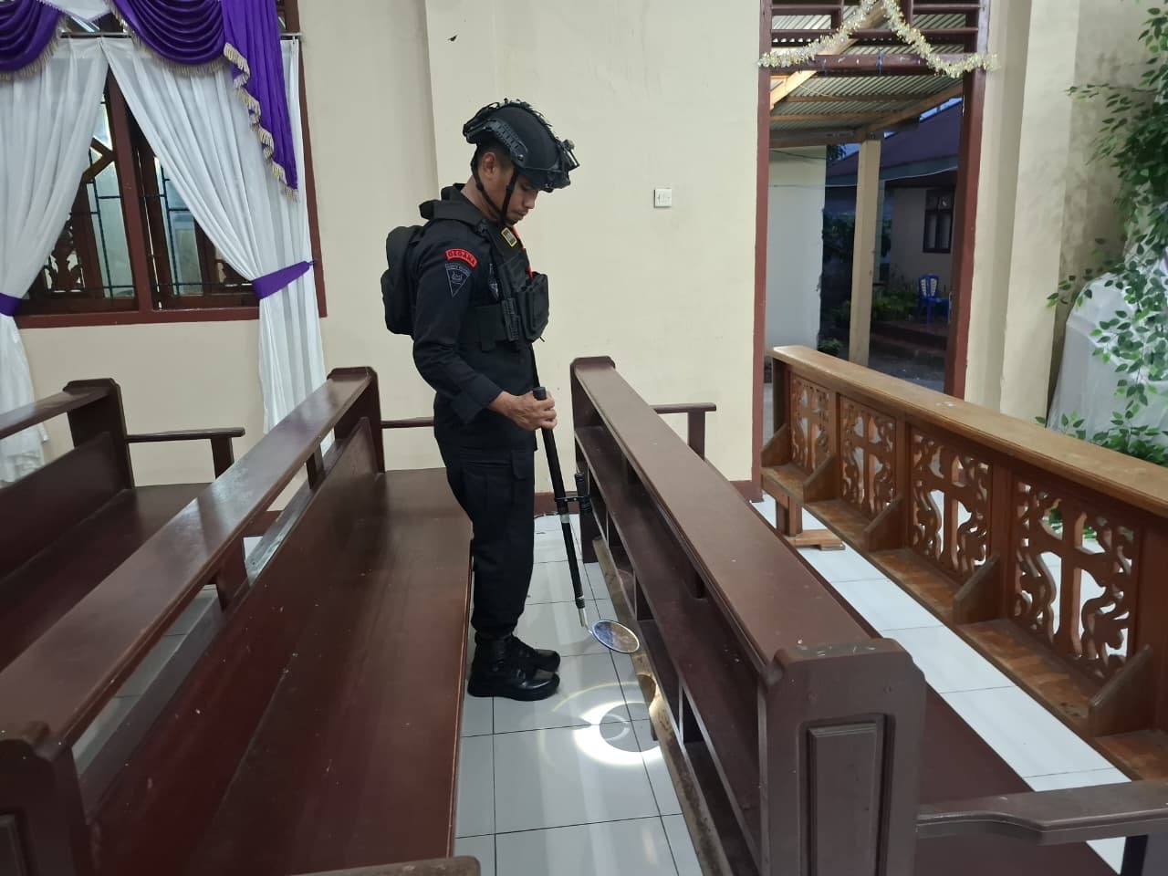 Personel Satuan Brimob Polda Maluku Utara yang tergabung dalam Operasi Lilin Kieraha 2025 melaksanakan kegiatan sterilisasi di sejumlah rumah ibadah menjelang pelaksanaan ibadah malam pergantian tahun, Rabu (31/12/2025).