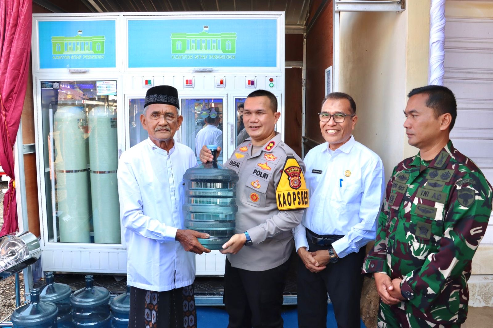Kapolres Pidie Jaya AKBP Ahmad Faisal Pasaribu dalam sambutannya menyampaikan bahwa depot air minum RO ini bersumber dari bantuan Kantor Staf Kepresidenan yang diperuntukkan bagi masyarakat secara gratis.