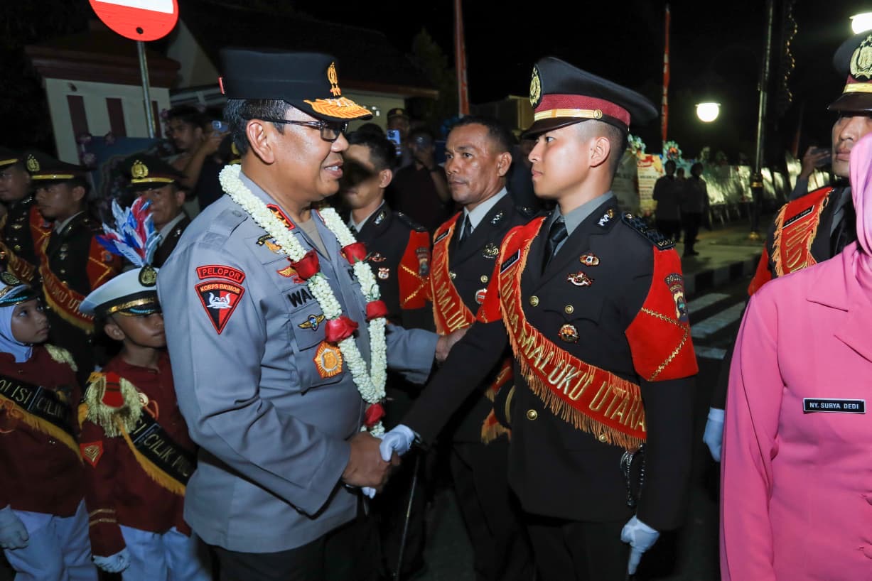 Prosesi pelepasan ditandai dengan penghormatan pasukan serta tradisi pedang pora yang menjadi simbol penghargaan atas dedikasi dan pengabdian selama menjabat sebagai Kapolda Maluku Utara. Suasana haru tampak menyelimuti jalannya upacara.