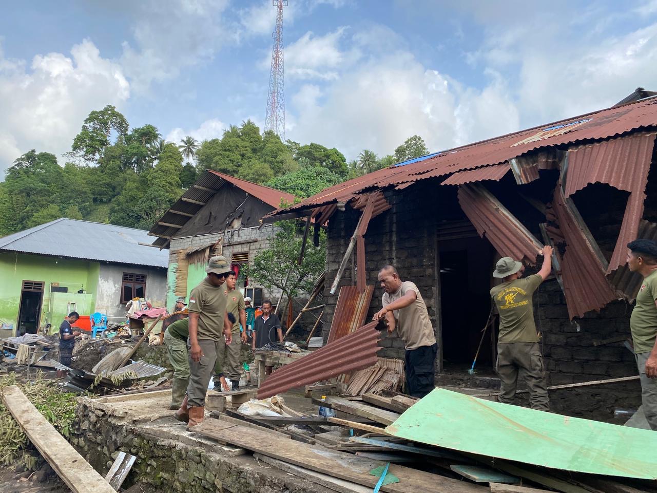 Personel gabungan TNI–Polri bersama Basarnas dan Satuan Polisi Pamong Praja (Satpol PP) melaksanakan kegiatan pembersihan sisa-sisa material banjir di area permukiman warga pascabencana alam banjir yang melanda Kecamatan Ibu, Kabupaten Halmahera Barat.