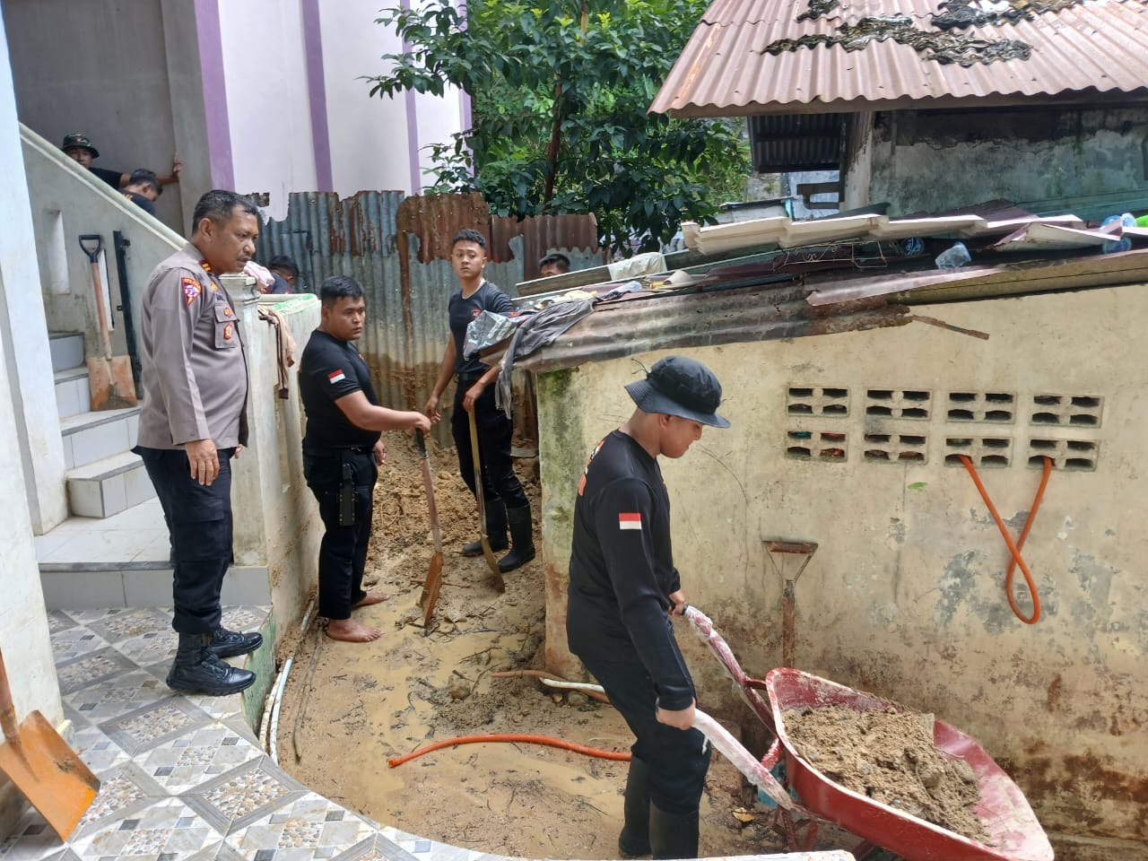 SIBOLGA — Guna membantu masyarakat terdampak bencana alam, Polsek Sibolga Sambas bersama personel Polres Sibolga dan BKO Brimob melaksanakan kegiatan Kurve pembersihan akses jalan yang tertutup material longsor.