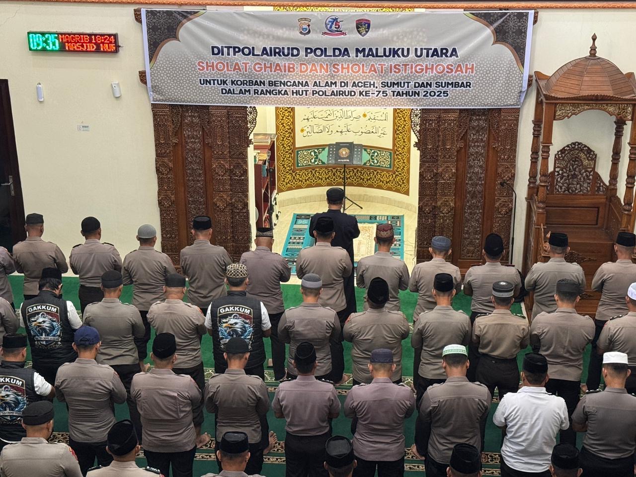 Direktorat Kepolisian Perairan dan Udara (Polairud) Polda Maluku Utara menggelar salat gaib dan salat istighosah untuk para korban bencana alam di Aceh, Sumatera Utara, dan Sumatera Barat. Pada senin (1/12/2025) di Masjid Nurul Huda