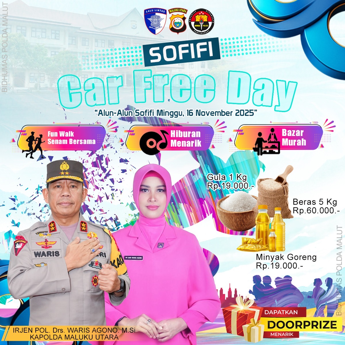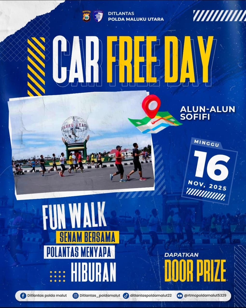 Kepolisian Daerah Maluku Utara, melalui Direktorat Lalu Lintas bersinergi dengan Pemerintah Provinsi (Pemprov) Maluku Utara akan menggelar Car Free Day (CFD) perdana di Alun-alun Sofifi. Acara yang terbuka untuk umum ini akan dilaksanakan pada Minggu, 16 November 2025.