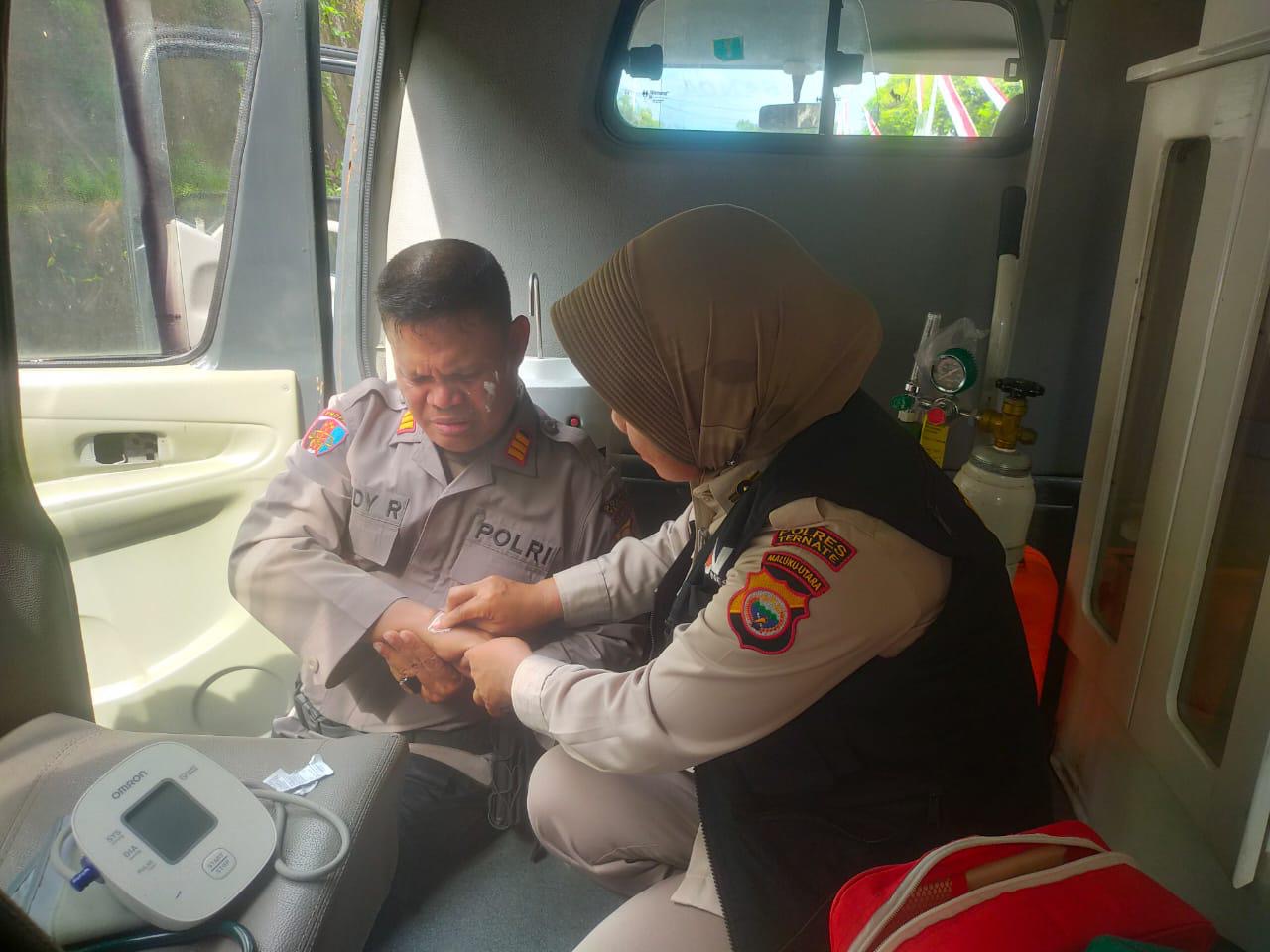 Pelaksanaan unjuk rasa di depan Kantor DPRD Kota Ternate, Kelurahan Kalumata, Senin (1/9) kemarin sempat terjadi ketegangan yang mengakibatkan sejumlah orang mengalami luka-luka dan membutuhkan penanganan medis. Menyikapi hal tersebut, Tim Mobile Urusan Kesehatan (Urkes) Polres Ternate langsung diterjunkan untuk memberikan pertolongan cepat di lokasi.