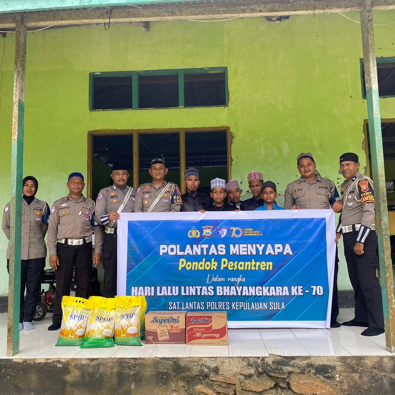 Peringati Hari Lalu Lintas Bhayangkara yang ke-70, Satuan Lalu Lintas Polres Kepulauan Sula menunjukkan bakti nyatanya dengan melaksanakan kegiatan anjangsana dan bakti sosial di Pondok Pesantren Desa Wailau, Kabupaten Kepulauan Sula, Maluku Utara, pada Senin (8/9) kemarin.