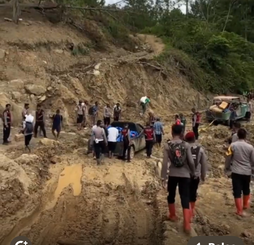 Perjalanan menuju Kecamatan Pining dihadapkan pada berbagai kendala, mulai dari jalan licin, lumpur tebal, hingga material banjir yang menutup hampir seluruh jalur. Di sejumlah titik, rombongan harus berhenti dan menunggu alat berat membuka jalan. Kapolres bersama unsur pemerintah daerah secara langsung mengawal proses pembukaan akses agar jalur dapat segera dilalui.