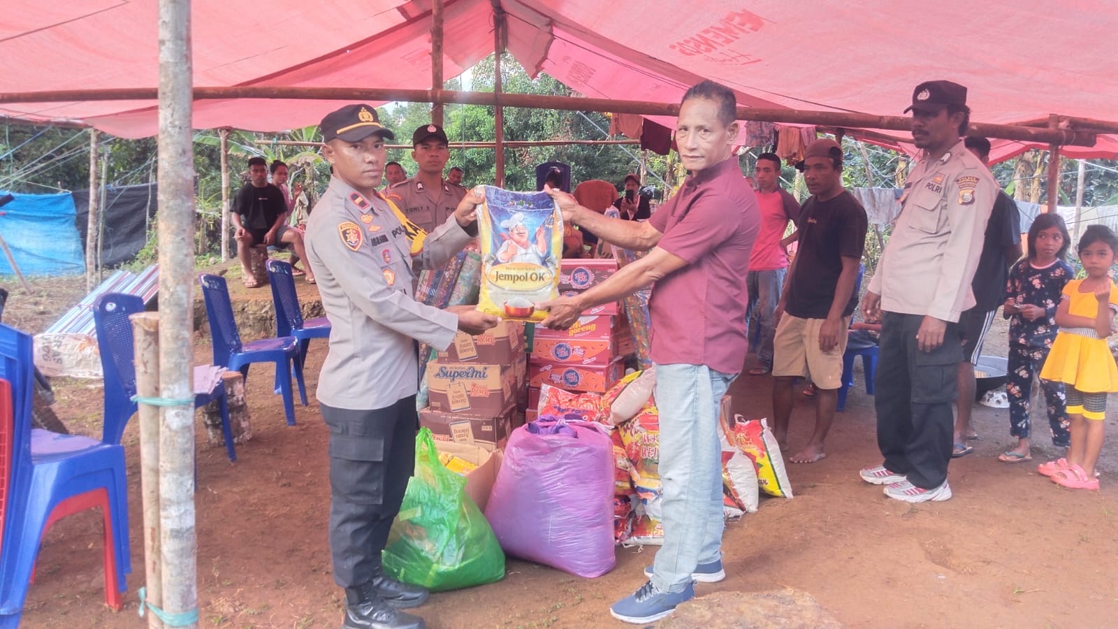Di tengah suasana duka akibat bencana alam yang melanda Desa Totala Jaya, Kecamatan Loloda, kehadiran aparat Kepolisian menjadi penguat harapan bagi warga yang kini harus bertahan di tempat pengungsian.