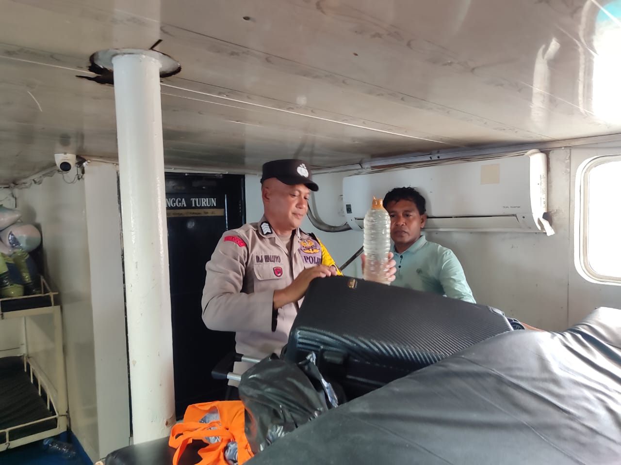 Dalam pemeriksaan yang dilakukan oleh personel piket Polsek Kawasan Pelabuhan Ahmad Yani, ditemukan sejumlah minuman beralkohol ilegal tanpa izin di Dek 1 Kapal, tepatnya di area ranjang penumpang.