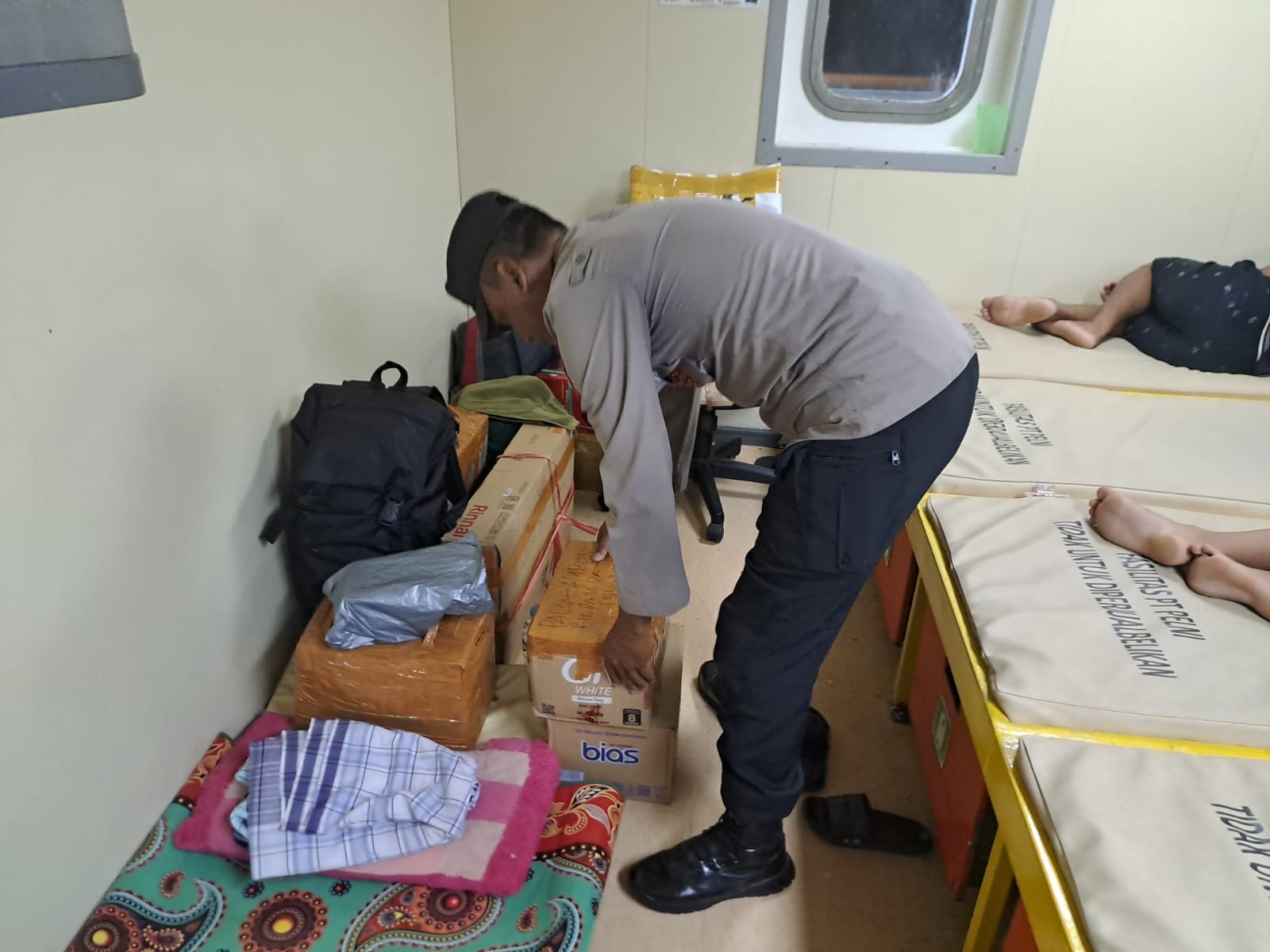 Ternate – Personel Polsek Kawasan Pelabuhan Ahmad Yani melaksanakan razia minuman keras (miras) dan barang ilegal lainnya di atas Kapal KM. Dorolonda yang tiba di Pelabuhan Ahmad Yani, Kelurahan Kota Baru, Kecamatan Ternate Tengah, Rabu (01/4/26).