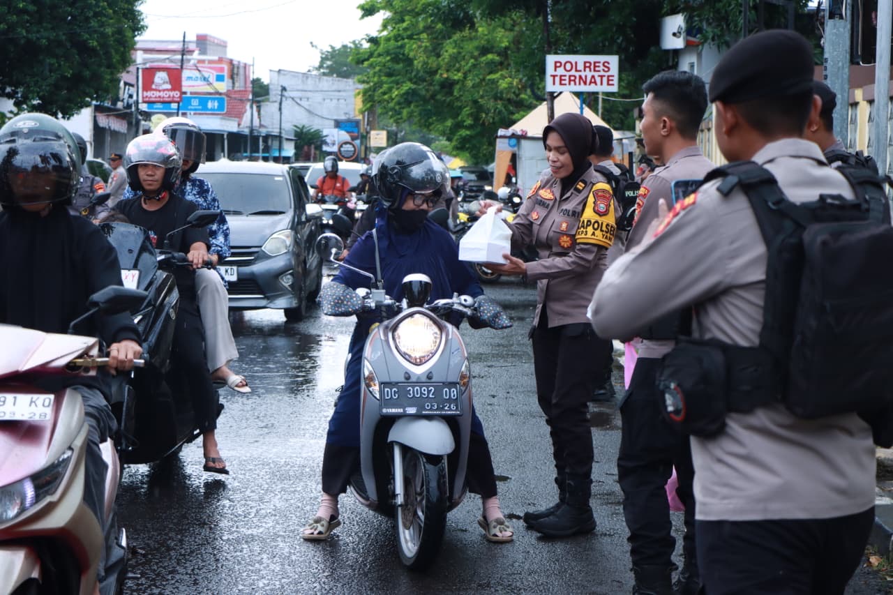 Kegiatan ini dipimpin langsung oleh Kapolres Ternate, AKBP Anita Ratna Yulianto, S.I.K., M.H., didampingi Wakapolres Ternate, Kompol Kurniawi H. Barmawi, S.I.K., M.Si., serta seluruh pejabat utama dan personil Polres Ternate. Sebanyak 300 paket takjil dibagikan secara langsung kepada masyarakat, khususnya pengguna kendaraan roda dua yang melintas di depan Mako Polres Ternate.