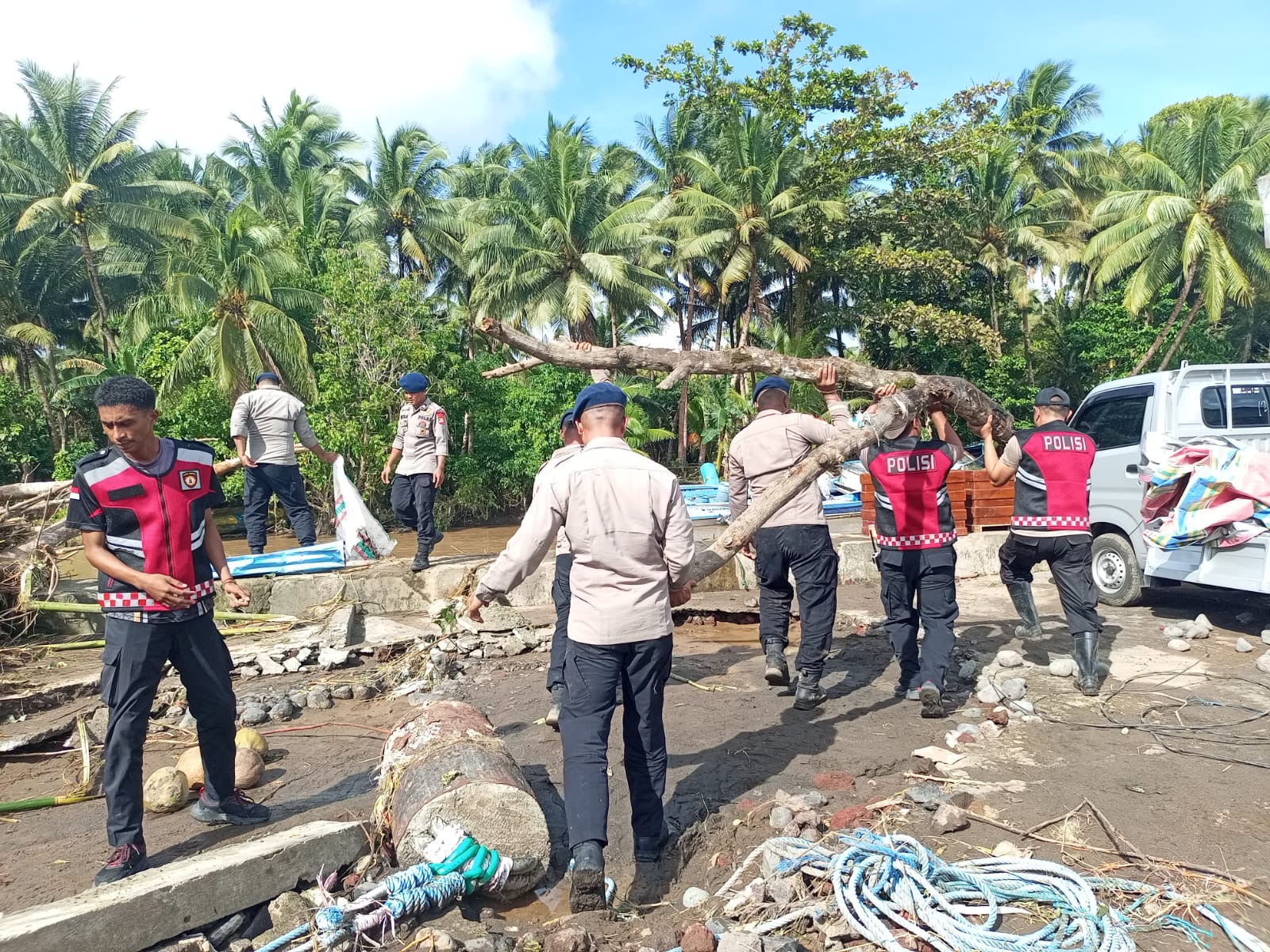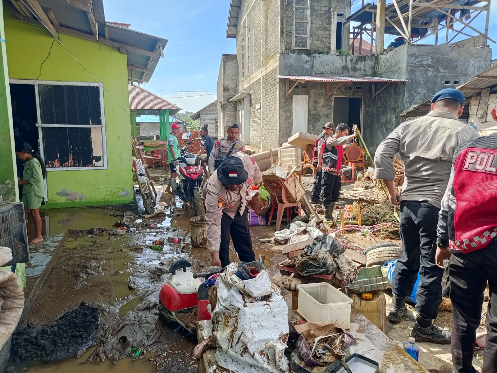 Personel Polri menunjukkan respon cepat dalam membantu masyarakat yang terdampak banjir di Kec. Ibu Kab. Halmahera Barat dengan turun langsung membersihkan rumah-rumah warga yang terendam. Bersama masyarakat setempat, anggota Polri bergotong royong membersihkan lumpur, sampah, serta sisa material yang terbawa arus banjir.