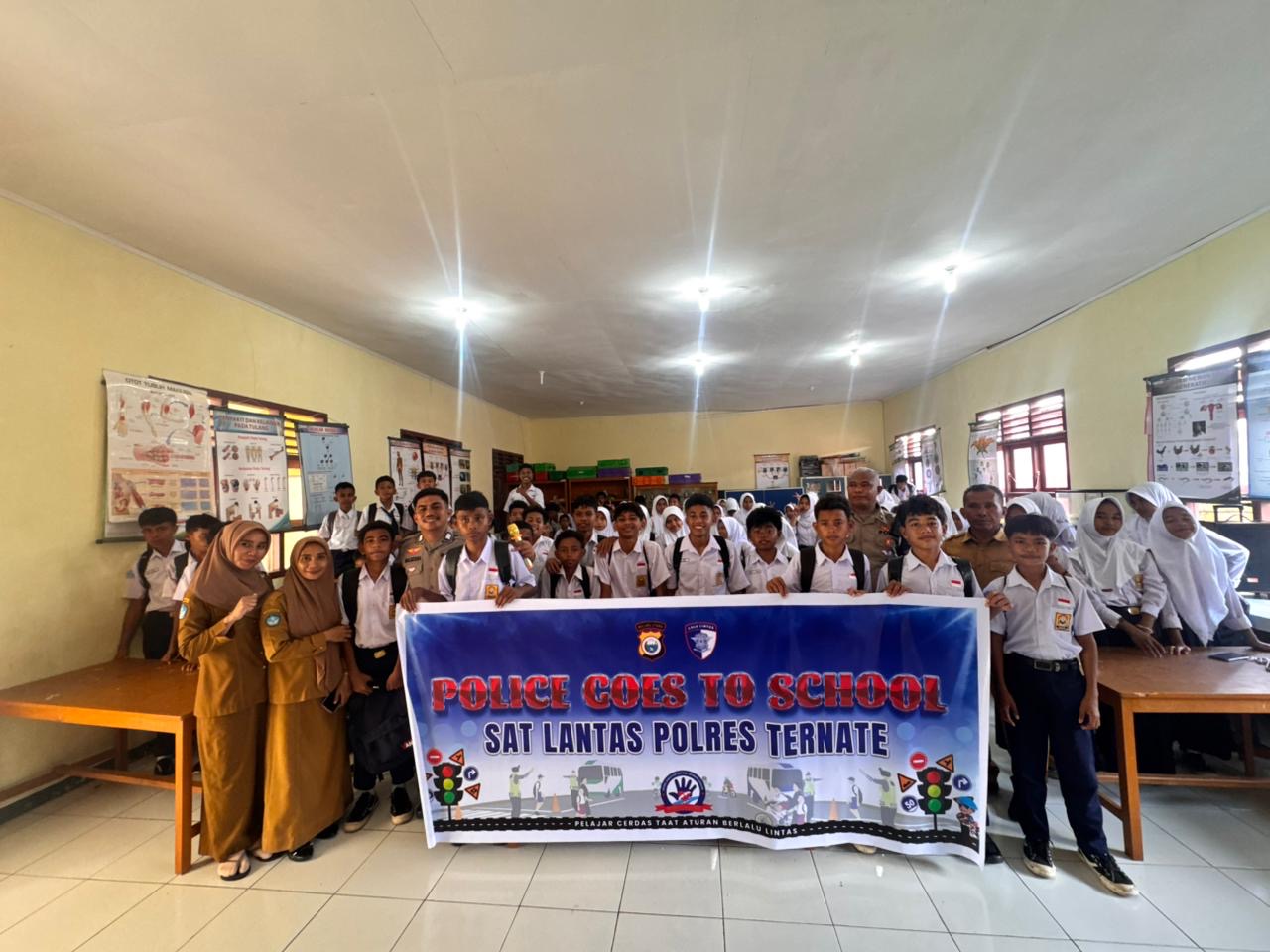 Kasat Lantas Polres Ternate Kasat Lantas Polres Ternate, Akp Farha S.Tr.K ,S.Ik ,Melalui Kasi Humas Ternate Akp Umar Kombong, S.H,Menyampaikan Bahwa Program Police Goes to School ini bertujuan untuk mendekatkan Polri dengan para pelajar sekaligus memberikan pemahaman sejak dini mengenai budaya tertib berlalu lintas.