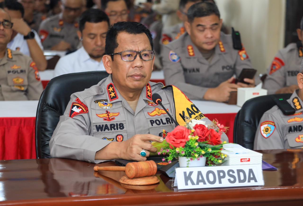 Kapolda Maluku Utara, Irjen Pol. Drs. Waris Agono, M.Si., memimpin kegiatan Latihan Pra Operasi (Lat Pra Ops) Ketupat Kie Raha 2026 yang digelar di Ruang Rapat Utama (Ruppatama) Lantai 3 Gedung Hoegeng Imam Santoso Polda Malut, Rabu (11/3/2026).