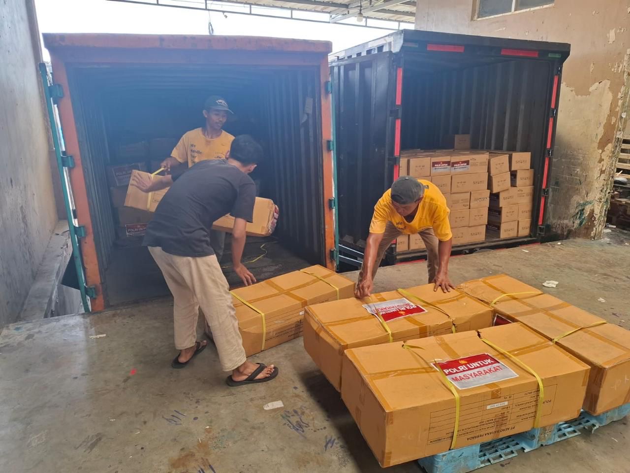 Bantuan berasal dari Satuan Logistik (SLOG) Polri dan saat ini seluruh barang telah berada di RA Rawa Bokor – PT Adhia Avia Prima untuk proses booking dan loading sebelum diterbangkan.