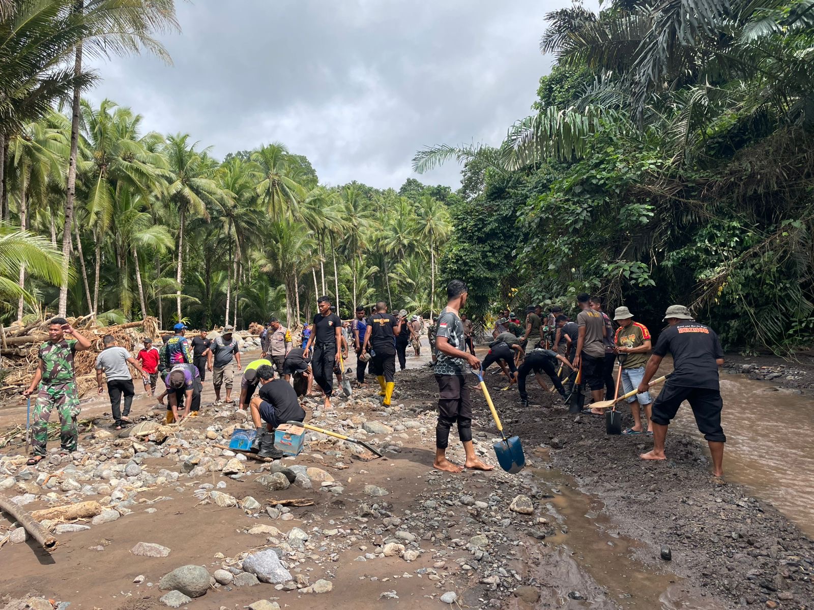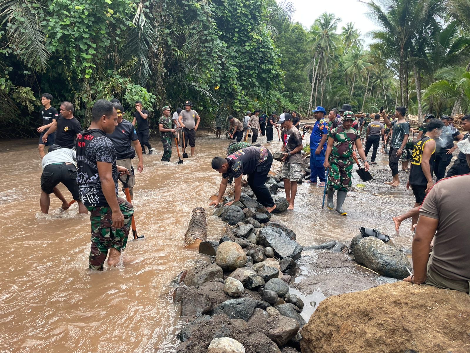 Personel Satuan Tugas (Satgas) Gabungan Penanganan Bencana Alam terus melaksanakan kegiatan bakti sosial di aliran sungai yang menjadi penyebab terjadinya banjir. Kegiatan tersebut difokuskan pada upaya penutupan dan penguatan jalur sungai guna mencegah air merembes keluar dari aliran utama.