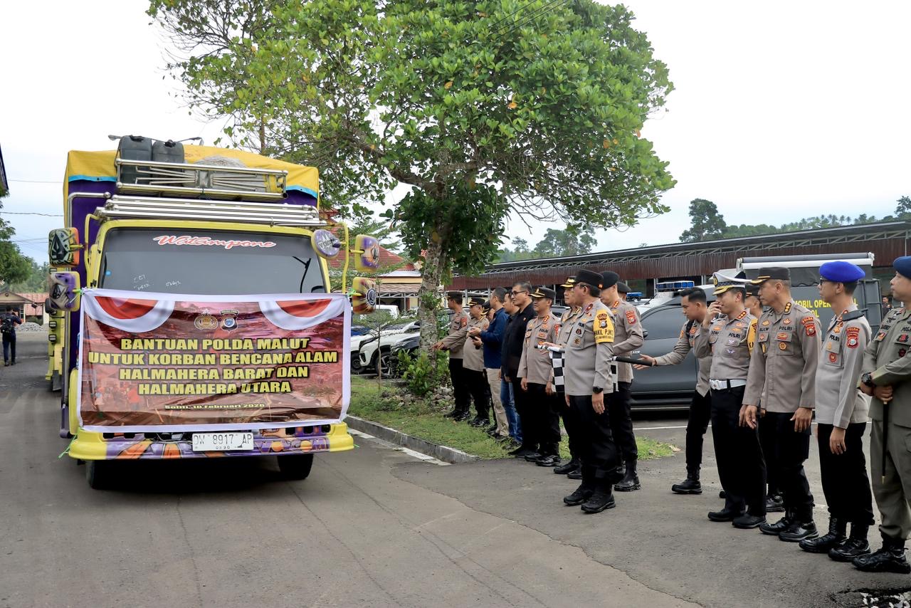 Mewakili Kapolda Maluku Utara, Wakapolda memimpin langsung apel pelepasan kendaraan pengangkut bantuan logistik untuk korban bencana alam di wilayah Kabupaten Halmahera Utara dan Halmahera Barat, Selasa, (10/1).