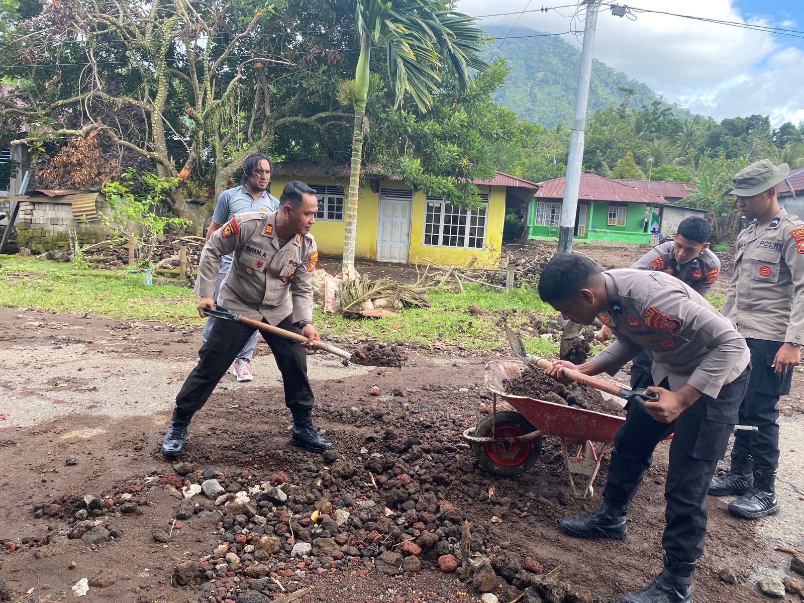 Sebagai bentuk kepedulian terhadap keselamatan dan kenyamanan masyarakat pengguna jalan, Satuan Samapta Polres Halmahera Barat melaksanakan aksi tanggap darurat membersihkan material batu dan tanah yang menutupi badan jalan akibat banjir, Selasa (7/10).